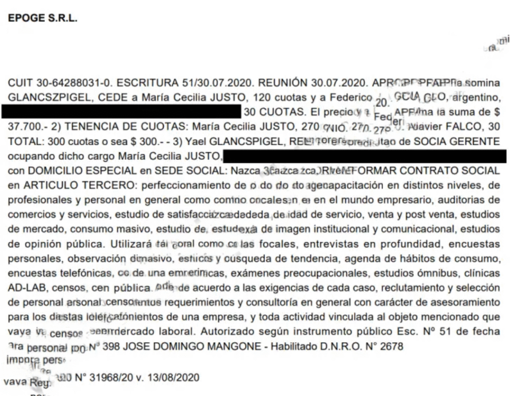 De allí nace Move Group, la consultora fantasma utilizada como pantalla en las campañas de múltiples candidatos y espacios, desde el Frente para la Victoria y la Unión Cívica Radical (UCR) hasta Ernesto Sanz, María Eugenia Vidal, Sergio Massa, Horacio Rodríguez Larreta y Javier Milei. Aunque La Libertad Avanza repitió hasta el hartazgo que su campaña fue realizada a “costo cero”, los registros muestran que Green Consult y Epoge SRL (CUIT 30642880310), también del entorno Caputo – Garat y vinculada a María Cecilia Justo y Federico Javier Falco, gastaron millones en Google.
