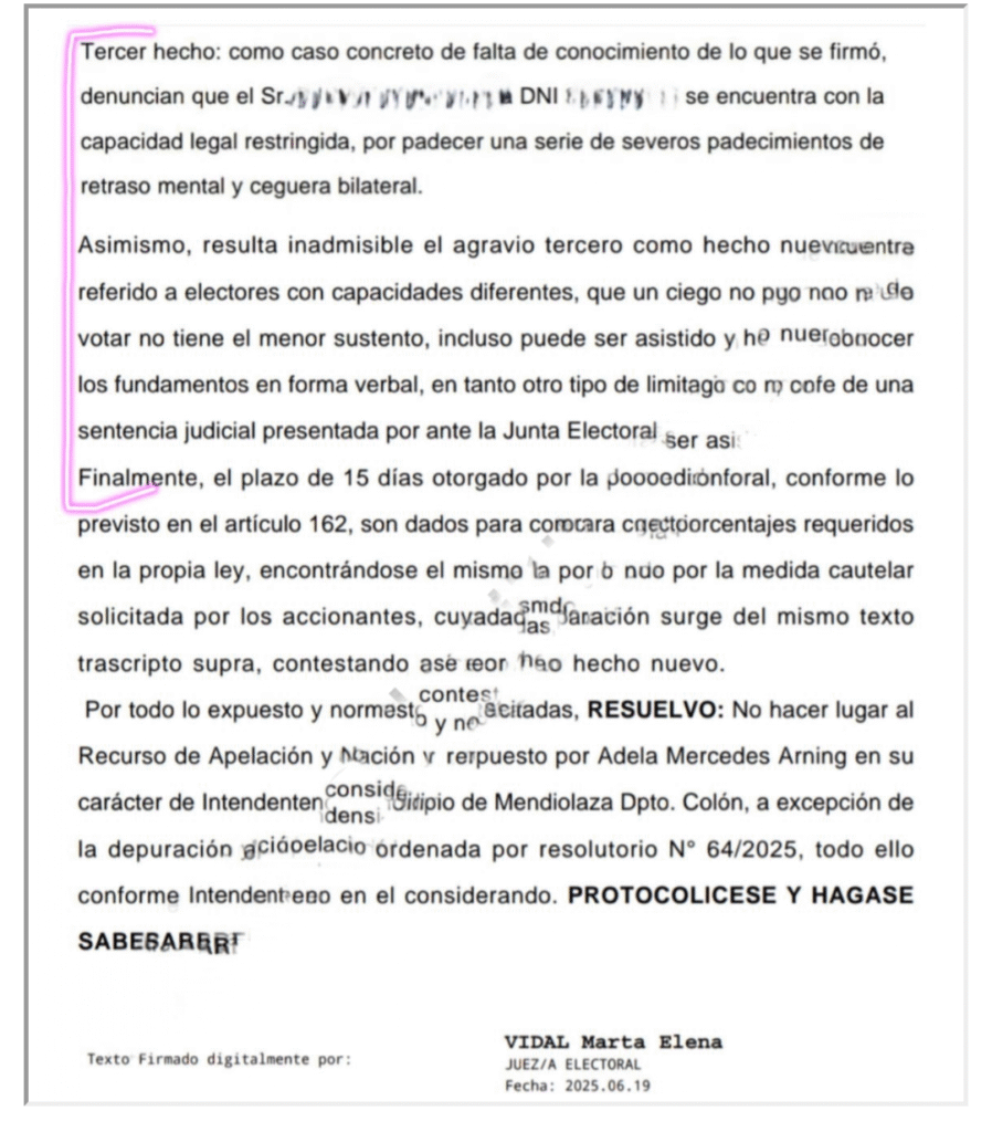 El fallo judicial, fechado el 19 de junio, rechazó el recurso de apelación y nulidad presentado por Arning, confirmando la validez del proceso de revocatoria. Finalmente, la jueza electoral Marta Elena Vidal resolvió, además, mantener la depuración del padrón ordenada previamente.