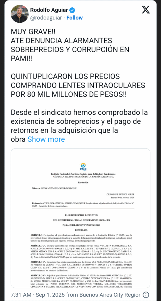 La denuncia de ATE no solo apunta al sobreprecio sino también a la calidad de los insumos. El gremio advierte que algunos productos defectuosos habrían provocado complicaciones en pacientes operados, y acusa al PAMI de haber eliminado controles y auditorías que antes regulaban estas compras. “El bochorno es mayúsculo”, dijo el dirigente Rodolfo Aguiar, señalando además que referentes libertarios buscan asociar su imagen a la llamada Campaña Visión, una política oftalmológica ahora bajo sospecha.