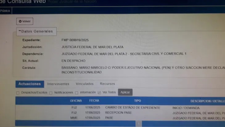 El expediente, caratulado “Bassano, Mario Marcelo c/ Poder Ejecutivo Nacional (PEN) y otro s/ Acción Meramente Declarativa de Inconstitucionalidad”, quedó registrado bajo el número 9919/2025 y tramita bajo las normas del juicio ordinario. El “otro” demandado en la causa corresponde al ministerio de Seguridad que conduce Patricia Bullrich, autora de la polémica resolución publicada este martes en el Boletín Oficial.