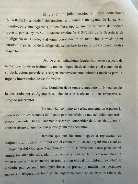 En el marco de esta causa, una persona identificada como “Agente 4”, se presentó a declarar en el juzgado federal y confirmó que lo habían mandado a seguir a representantes de jugadores de futbol cuando Gustavo Arribas era jefe de la exAFI.