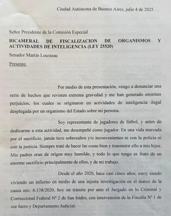 Enclae.agr tuvo acceso a una nota que Uriel le envió al senador nacional Martín Lousteau, en su rol de titular de la Comisión Bicameral de Fiscalización de Organismos de Actividad de Inteligencia, el pasado 5 de julio. “Desde el año 2020, hace casi cinco años, estoy siendo viviendo un infierno en medio de una injusta investigación en el marco de la causa nro. 6.138/2020, hoy en trámite por ante el Juzgado en lo Criminal y Correccional Federal Nº 2 de San Isidro, con intervención de la Fiscalía N deg 1 de ese fuero y Departamento Judicial”, detalla en el texto.