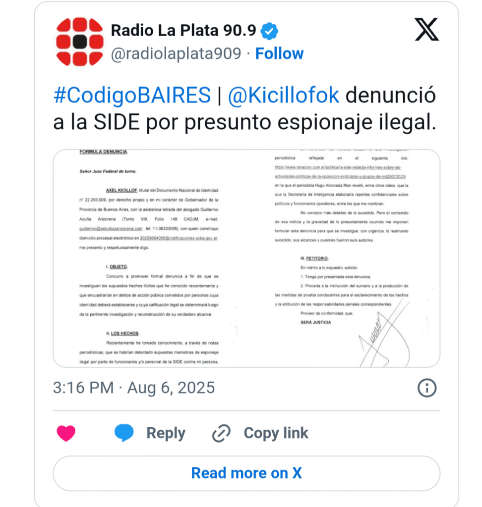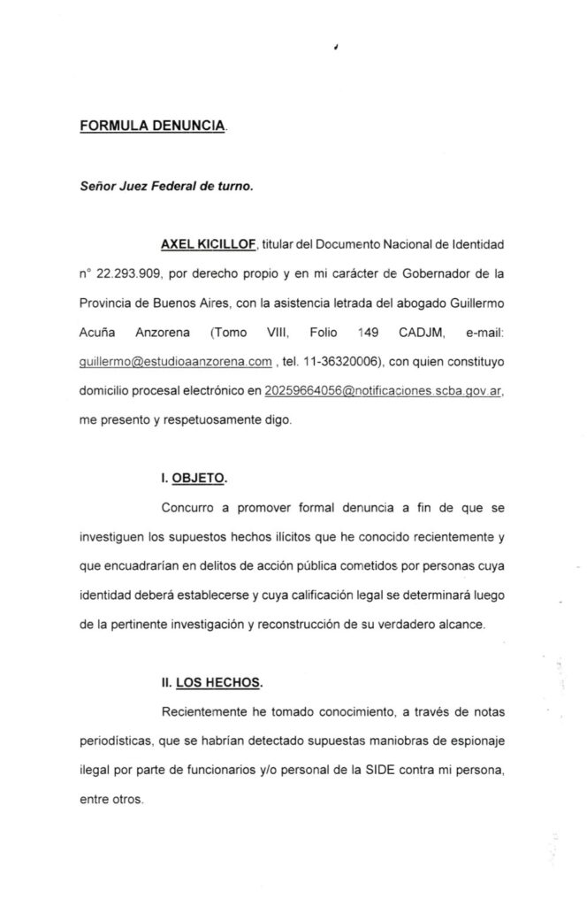El gobernador bonaerense Axel Kicillof presentó una denuncia penal contra la Secretaría de Inteligencia del Estado (SIDE) por presuntas maniobras de espionaje ilegal. La presentación fue radicada en el Juzgado Federal N°1 de La Plata, a cargo de Alejo Ramos Padilla, y se da luego de una nota publicada en el diario La Nación, por el periodista platense Hugo Alconada Mon.