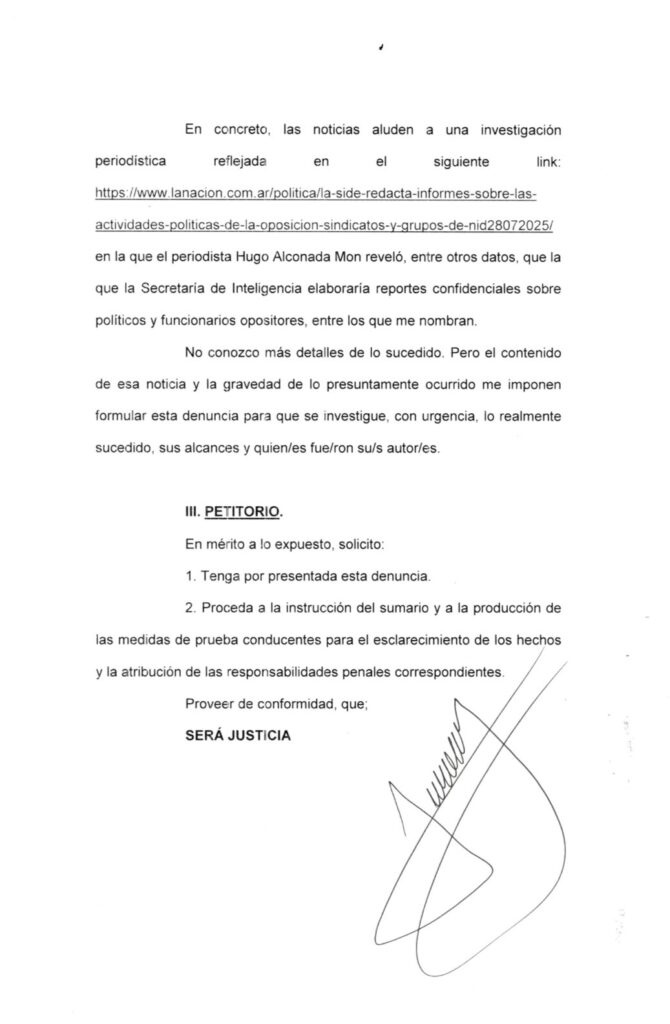 Asimismo, el mandatario provincial afirmó en el escrito que tomó conocimiento de “supuestas maniobras de espionaje ilegal por parte de funcionarios y/o personal de la SIDE contra mi persona”, y sostuvo que no cuenta con “más detalles de lo sucedido”, por lo que pidió que se investigue con celeridad