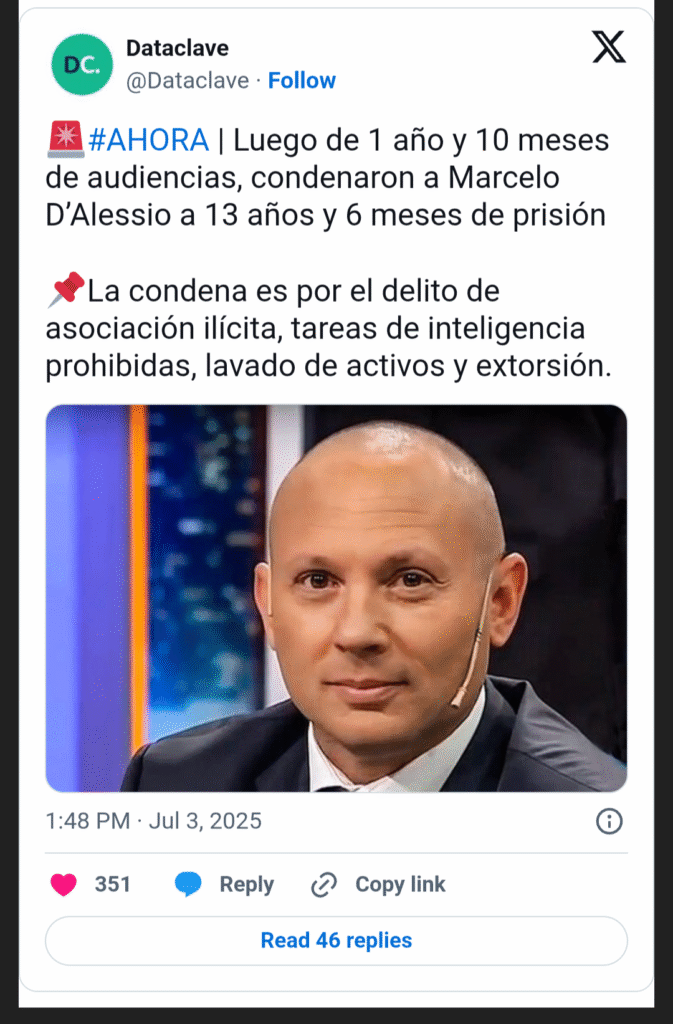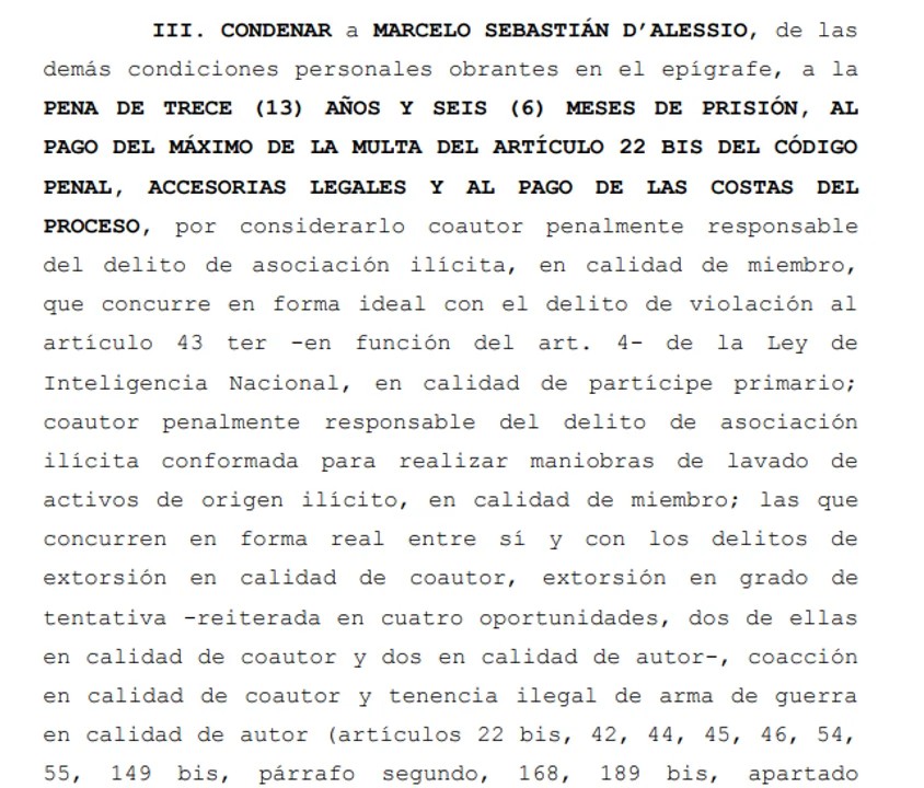 Los jueces Sabrina Namer, Nicolás Toselli y María Gabriela López Iñiguez consideraron responsable a D’Alessio por los delitos de asociación ilícita; violación a la Ley de Inteligencia, lavado de activos, extorsión -coautor-, intento de extorsión en cuatro episodios, coacción y tenencia ilegal de armas.