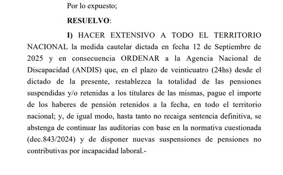 En el fallo, Martínez resolvió: “HACER EXTENSIVO A TODO EL TERRITORIO NACIONAL la medida cautelar dictada en fecha 12 de Septiembre de 2025 y en consecuencia ORDENAR a la Agencia Nacional de Discapacidad (ANDIS) que, en el plazo de veinticuatro (24hs) desde el dictado de la presente, restablezca la totalidad de las pensiones suspendidas y/o retenidas a los titulares de las mismas, pague el importe de los haberes de pensión retenidos a la fecha, en todo el territorio nacional; y, de igual modo, hasta tanto no recaiga sentencia definitiva, se abstenga de continuar las auditorias con base en la normativa cuestionada (dec.843/2024) y de disponer nuevas suspensiones de pensiones no contributivas por incapacidad laboral”.