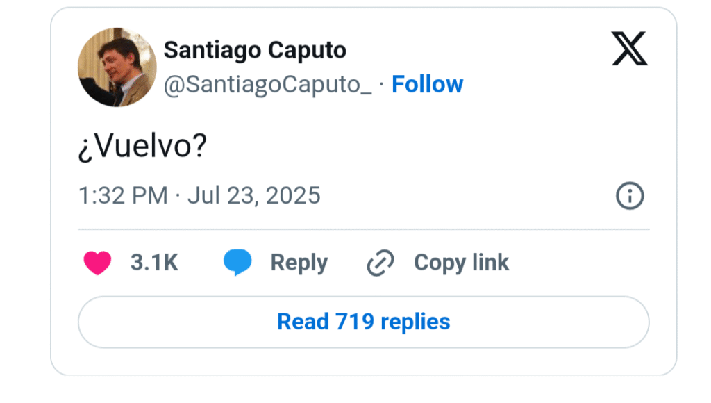 Volviendo a la filtración a mano de quien maneja la SIDE está claro que fue una represalia directa. Como informó este medio en varias oportunidades, Pareja dejó afuera de las listas bonaerenses a los referentes de Las Fuerzas del Cielo, el grupo de tuiteros libertarios que responde a Caputo y que había jugado fuerte durante la campaña presidencial. Por esto el asesor hizo sentir su bronca: no solo expuso a Pareja, también reactivó su disputa con Karina Milei y los Menem por el control del espacio.