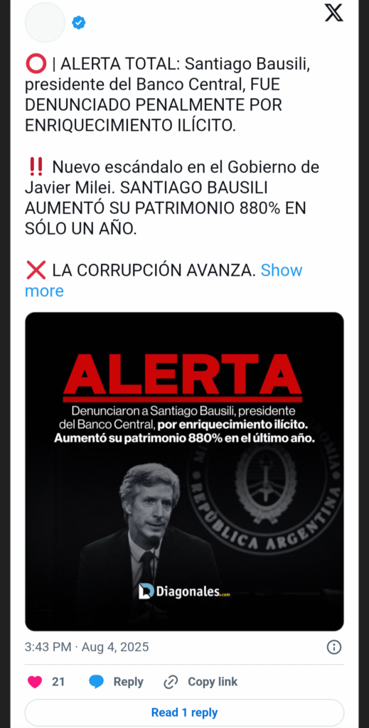 Un escándalo de grandes proporciones sacude al Gobierno de Javier Milei: en medio del ajuste y la motosierra, uno de los funcionarios más importantes del país multiplicó su patrimonio en un 880% en solo un año. Se trata de nada menos que Santiago Bausili, presidente del Banco Central de la República Argentina (BCRA), quien en la más reciente actualización de su Declaración Jurada (DDJJ) reportó una inusual suba que lo llevó a ser denunciado por presunto enriquecimiento ilícito.