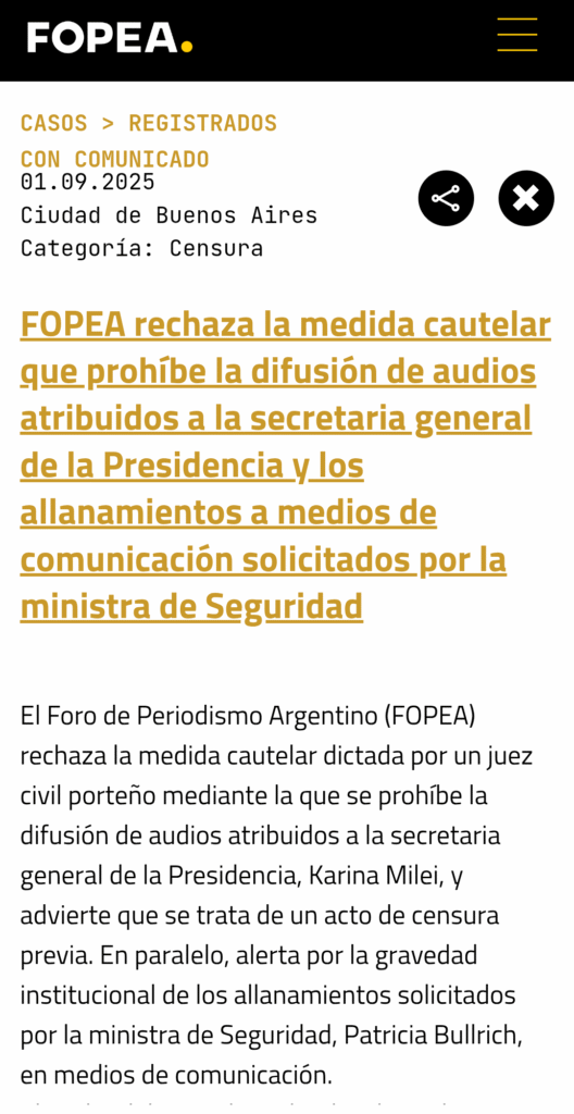El Foro de Periodismo Argentino (FOPEA) rechaza la medida cautelar dictada por un juez civil porteño mediante la que se prohíbe la difusión de audios atribuidos a la secretaria general de la Presidencia, Karina Milei, y advierte que se trata de un acto de censura previa. En paralelo, alerta por la gravedad institucional de los allanamientos solicitados por la ministra de Seguridad, Patricia Bullrich, en medios de comunicación.