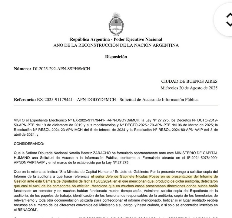 La justificación, pronunciada por Posse en su informe ante el Congreso en mayo pasado y reiterada por numerosos funcionarios libertarios hasta el cansancio, fue utilizada por las autoridades para cortar la ayuda social a los establecimientos. Tras ello, Zaracho interpuso un pedido a la información para conocer los detalles del desconocido relevamiento, pero Capital Humano le negó el acceso a los datos; no obstante, judicialización de por medio, el Gobierno finalmente se vio obligado a responder y confesó la verdad.