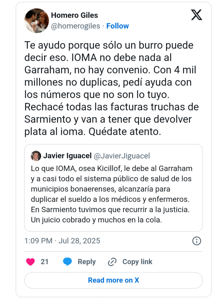 El titular de la obra social bonaerense, IOMA, Homero Giles, cruzó al ex intendente de Capitán Sarmiento, Javier Iguacel (el halcón mileista que volvió al negocio del petróleo con el Plan Andes y una multimillonaria licitación para operar yacimientos maduros de Neuquén), luego que éste acusara a la entidad y al gobernador Axel Kicillof de una cuantiosa deuda con el Hospital Garrahan