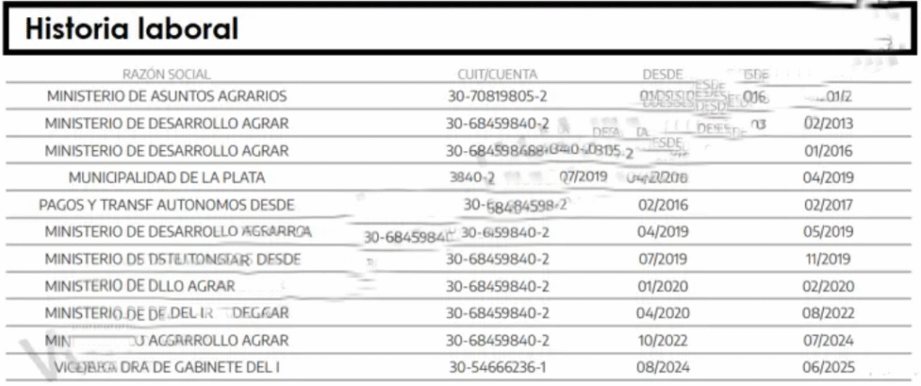 La progresión salarial de Osaba también resulta ilustrativa. En 2012, cobraba un sueldo que superaba los 6 mil pesos mensuales (unos 1.333 dólares según la cotización de entonces). Para cuando dejó el ministerio de Desarrollo Agrario en 2024, embolsaba 563.713,26 pesos (626 dólares). Hoy, como funcionario nacional, su salario asciende a 5.025.362,43 pesos, diez veces más que el anterior: es decir, unos 3.865 dólares. Un ascenso meteórico, sin escalas en el sector privado ni concursos públicos a la vista.