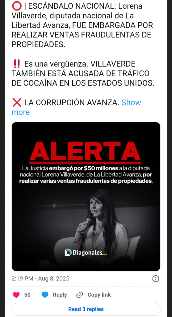 Un nuevo escándalo sacude, desde Río Negro, al Gobierno de Javier Milei y a todo La Libertad Avanza (LLA). En las últimas horas, la Justicia embargó a la diputada nacional Lorena Villaverde por una estafa millonaria en una venta de terrenos. Según la denuncia, los damnificados compraron propiedades en la exclusiva ciudad de Las Grutas pero nunca recibieron las escrituras ni ninguna habilitación para construir. Ahora, la dirigente libertaria se enfrenta a una retención preventiva de bienes por $50 millones.