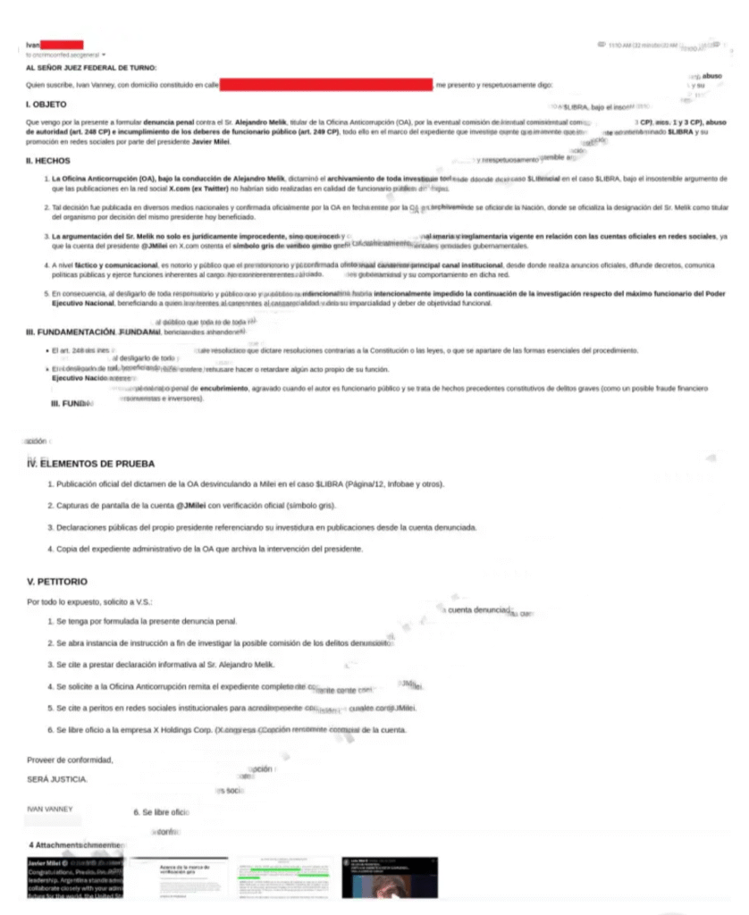 Un ciudadano mercedino, llamado Iván Vanney, presentó una denuncia penal contra Alejandro Melik, actual titular de la Oficina Anticorrupción (OA), acusándolo de encubrimiento agravado, abuso de autoridad e incumplimiento de los deberes de funcionario público, por haber cerrado anticipadamente cualquier posibilidad de investigación contra el presidente Javier Milei en relación con la promoción del criptoactivo $Libra.