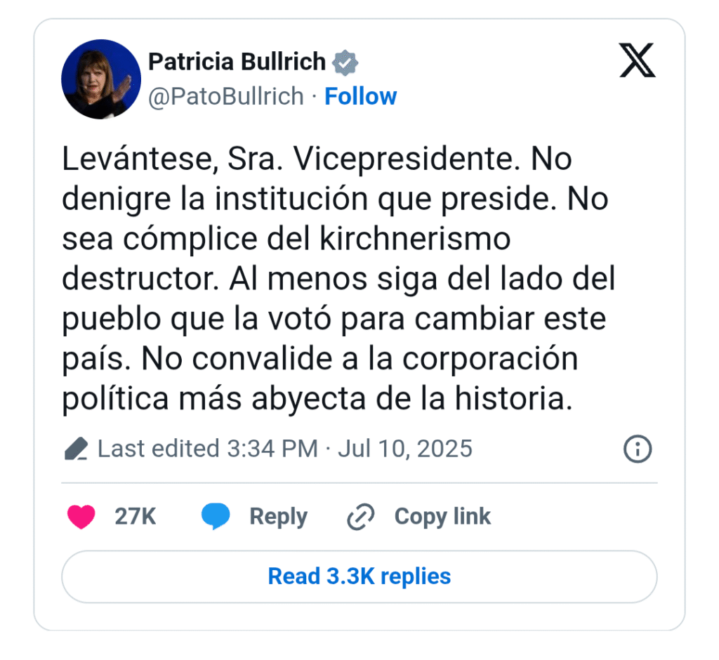 “Levántese, Sra. Vicepresidente. No denigre la institución que preside. No sea cómplice del kirchnerismo destructor. Al menos siga del lado del pueblo que la votó para cambiar este país. No convalide a la corporación política más abyecta de la historia”, lanzó Bullrich, que no seguramente no esperaba un contragolpe tan explosivo.