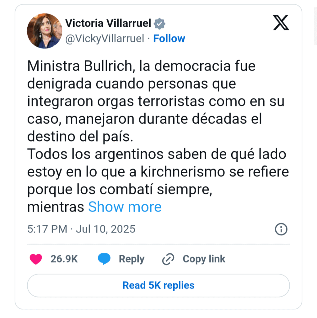 “Ministra Bullrich, la democracia fue denigrada cuando personas que integraron orgas terroristas como en su caso, manejaron durante décadas el destino del país”, le respondió Villarruel, que también le recordó a Patricia que “pululaba de partido en partido”.