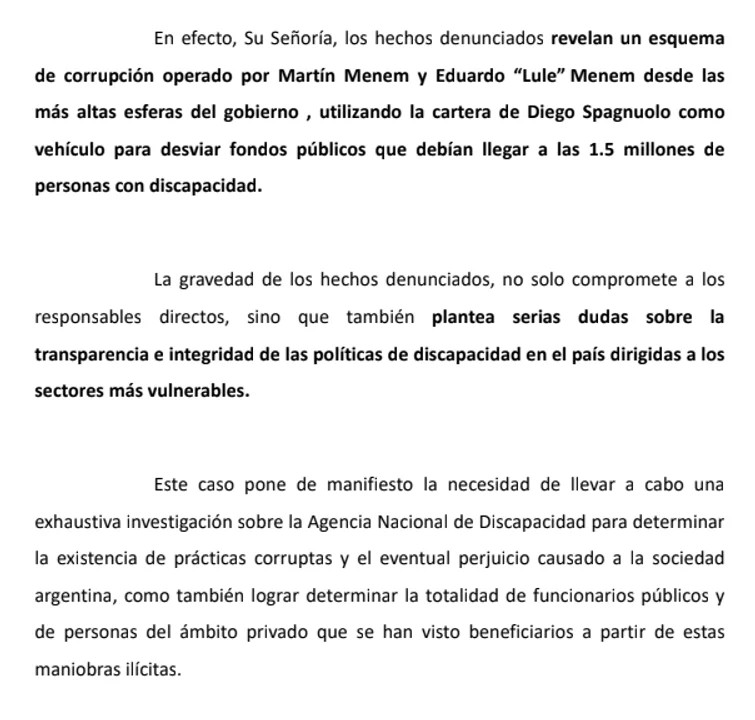 En la denuncia, se señala que Spagnuolo consultó a su abogado acerca de los riesgos legales de firmar expedientes con sobreprecios; y que le habría dicho que recibió presiones de “Lule” y de Martín Menem para avanzar con las contrataciones.