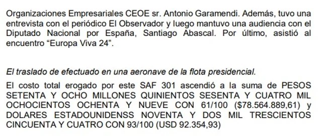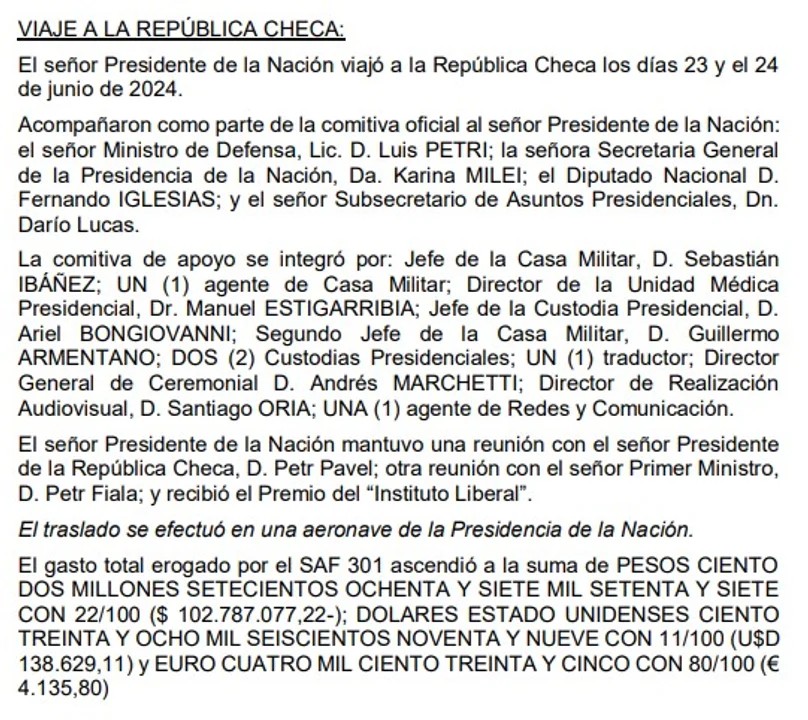 Aunque algunos de estos datos fueron averiguados de forma externa, la mayoría fueron proporcionados por el Gobierno en los detalles de los informes de gestión de Francos al Congreso. Es el caso, por ejemplo, de la gira N°6 a España, que según consta en la documentación oficial “ascendió a la suma de $78.564.889 y a US$92.354”; de la gira N°9 a España, Alemania y Chequia, que costó un acumulado de $102.787.077, US$138.629 y €4.135; o de la gira N°10 a Brasil, en la que Milei asistió a la Conferencia de Acción Política Conservadora (CPAC) en desmedro de la reunión del Mercosur que se desarrollaba en Paraguay, y suscitó gastos totales por $13.690.962 y US$8.660.