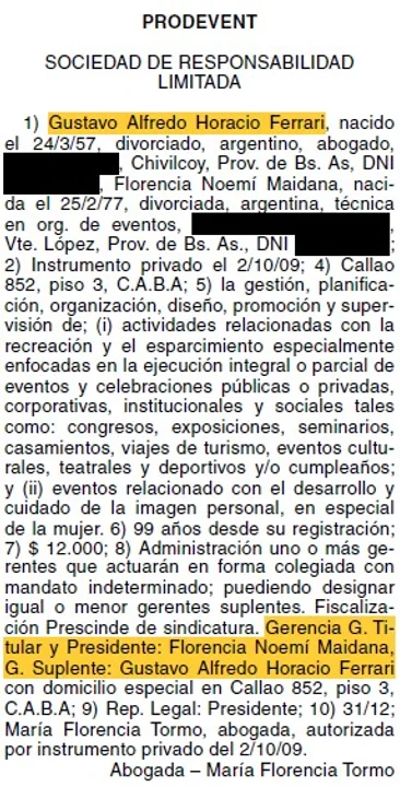 Como informó Diagonales al dar a conocer los detalles de la primera licitación, Prodevent fue fundada por Gustavo Ferrari en 2009 acompañado por Florencia Noemí Maidana, con quien se casaría poco después. En aquel año también comenzó su carrera política: fue legislador por dos años, diputado del Parlasur por otros dos y luego Asesor General de Gobierno del hoy libertario Daniel Scioli en la Provincia. Y su cargo más importante lo desempeñó entre 2016 y 2019, cuando fue Ministro de Justicia bonaerense de la gobernadora María Eugenia Vidal.