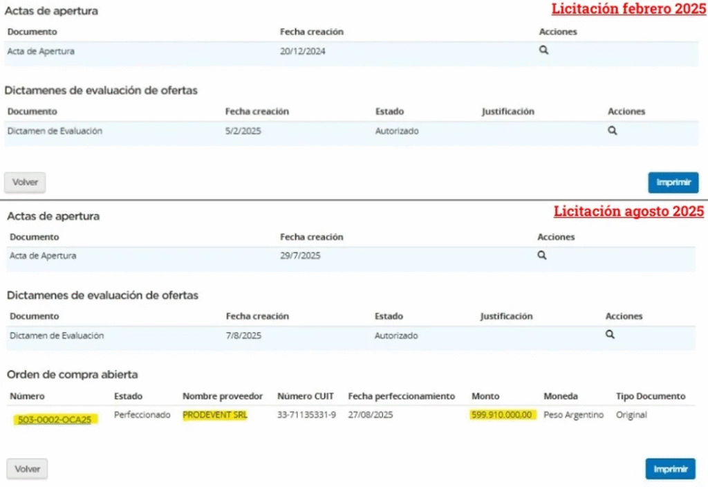 Esta segunda licitación fue una copia casi perfecta de su predecesora, incluidos numerosos elementos de lujo para los actos: carpas climatizadas, baños químicos “de primera línea”, servicio de limpieza y seguridad privadas, televisores, parlantes, escenario, aires acondicionados y más. También se repitió su adjudicatario: la empresa Prodevent SRL, fundada por el exfuncionario bonaerense Gustavo Ferrari, quien fuera Ministro de Justicia de María Eugenia Vidal en sus años como Gobernadora. El vínculo entre La Libertad Avanza (LLA) y el PRO parece, a la luz de los hechos, bastante aceitado.