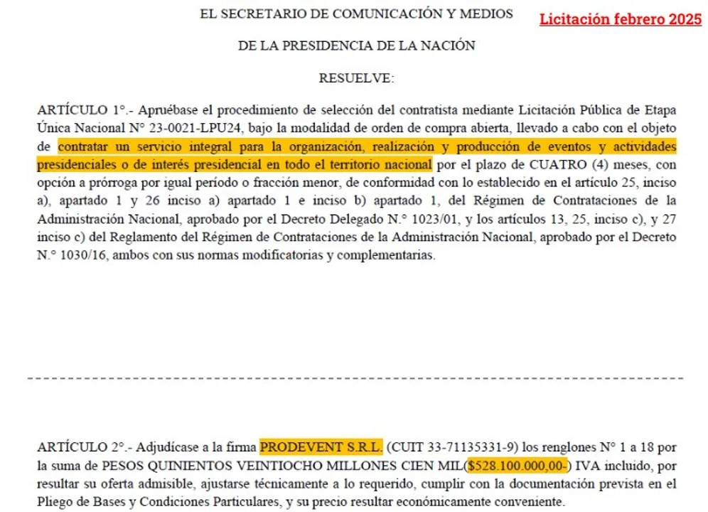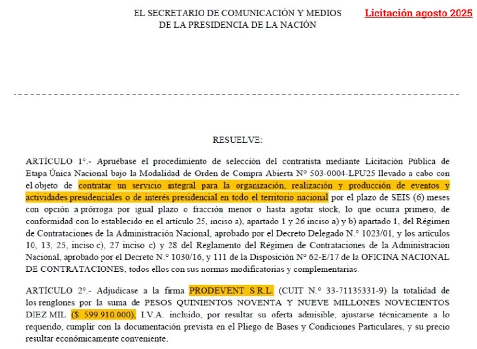 El 27 de agosto pasado, mientras el Presidente era increpado en una visita a Lomas de Zamora y su (ahora ex) candidato José Luis Espert huía en moto de la escena, Adorni le ponía la firma a una adjudicación de $600 millones para llevar a cabo el resto de los actos de campaña antes de las nacionales. La contratación, todavía activa, incluye 16 renglones de especificaciones técnicas y se divide según la localización de los eventos -AMBA o el interior del país- y su complejidad, con la posibilidad de que las actividades más grandes reciban hasta 10.000 asistentes.