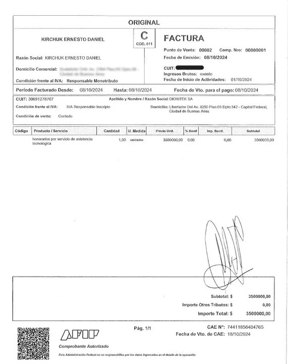 Según el mencionado informe, tras su nombramiento el especialista se creó un monotributo únicamente para cobrarle a la empresa $3,5 millones en paralelo a su sueldo fijo. Las autoridades “aclararon” luego que la conducta fue extraordinaria, duró solo dos meses y durante ese plazo se interrumpió su remuneración básica, aunque expertos en el área elevaron sus sospechas sobre la maniobra. Página aparte para el hecho de que Kirchuk también trabaja en la Comisión Nacional de Energía Atómica (CNEA), dueña del 48% de Dioxitek, así que en cierta forma es empleado de sí mismo.