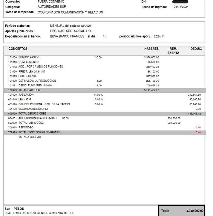 Sea por su éxito como redactor o por el buen vínculo que, se dice, mantiene con el influencer y funcionario Juan Pablo Carreira -alias Juan Doe–, a Ramos Nápoli le fue tan bien en el despacho de “El Jefe” que a fines del año pasado el Gobierno lo “ascendió” a Gerente General de Dioxitek. Como se ve, su currículum no presenta formación o experiencia remotamente cercana al área nuclear, pero eso no dejó exento a Ramos Nápoli de la silla en el Directorio, de los viajes con la compañía ni, por supuesto, de una millonaria remuneración que en diciembre de 2024 fue de $6.557.914. Más de $6,5 millones mensuales para el ex troll de Karina.