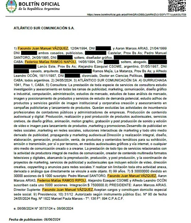 Lo interesante del caso es que Ramos Nápoli no llegó solo. Su desembarco en la empresa productora de combustible nuclear se dio junto al de un colega de su misma edad y campo de trabajo: Facundo Juan Manuel Vázquez. Un dato crucial para comprender el vínculo entre ambos es la experiencia laboral que los une: el paso por la consultora Atlántico Sur Comunicación, una agencia de publicidad, márketing, producción de contenido audiovisual y gestión de redes sociales que ellos mismos fundaron junto a otras cuatro personas en junio de 2024.