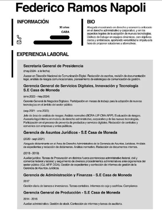 El actual Gerente General de una de las estatales nucleares más importantes del país tiene 30 años. Federico Ramos Nápoli es abogado por la Universidad de Buenos Aires (UBA), advierte formación en “derecho administrativo, derecho corporativo y derecho de las nuevas tecnologías”, y en LinkedIn señala que “completó una maestría”, pero todavía adeuda la tesis que planeaba presentar “en los primeros meses de 2023”. Por lo demás, a sus 20 ingresó al sector público con un puesto en la Casa de la Moneda; desde entonces, nunca dejó de trabajar para el Estado.