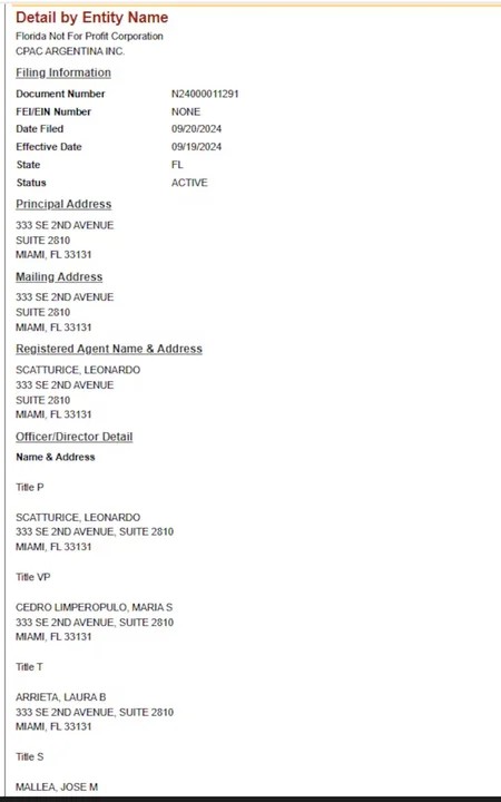 Adicionalmente, la cercanía entre “la valijera” y el nuevo dueño de FlyBondi es tal que ambos figuran en la primera plana de la fundación sin fines de lucro CPAC Argentina Inc., una organización que tiene a Scatturice como Director y a Laura Arrieta como Tesorera. A la par, cada uno trabaja para el Gobierno a su manera: el nuevo dueño de FlyBondi realiza tareas diplomáticas para la SIDE y gestiona las reuniones entre Trump y Milei en suelo estadounidense, y “la valijera” organiza eventos de ultraderecha en Buenos Aires como la CPA