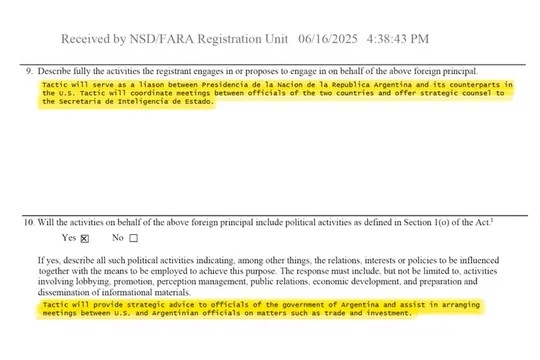 Recientemente, La Nación dio a conocer una última operación que llamó la atención no solo en la opinión pública sino también en el propio Gobierno: la compañía Tactic Global LLC, también propiedad de Scatturice, fue contratada por la SIDE para hacer tareas de “lobby” en Estados Unidos. El arreglo busca aceitar las relaciones entre la Casa Blanca y la Casa Rosada, particularmente dado el alcance del que goza el exagente de Inteligencia en la administración republicana. El negocio se tradujo en un pago de US$10.000 mensuales aproximadamente para la agencia privada.
