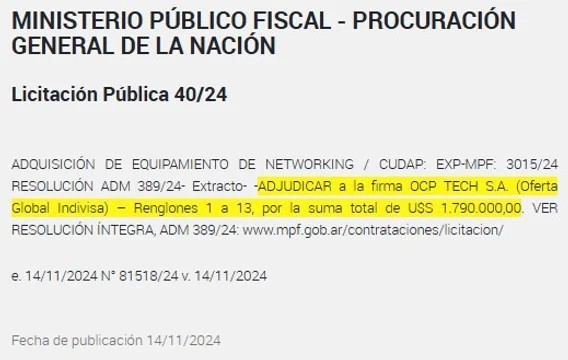 Un último ejemplo servirá para terminar de ilustrar el caso. Entre septiembre de 2024 y marzo de 2025, el Ministerio Público Fiscal libertario le adjudicó a OCP Tech nada menos que ocho contrataciones – todas pagadas en dólares. La más impactante fue rubricada el 14 de noviembre pasado y acarrea una inmensa erogación de fondos públicos de US$1.790.000 en una única operación. El negocio le significó a Scatturice un acumulado de US$5 millones recibido a lo largo de un semestre y pico y exclusivamente desde el MPF.