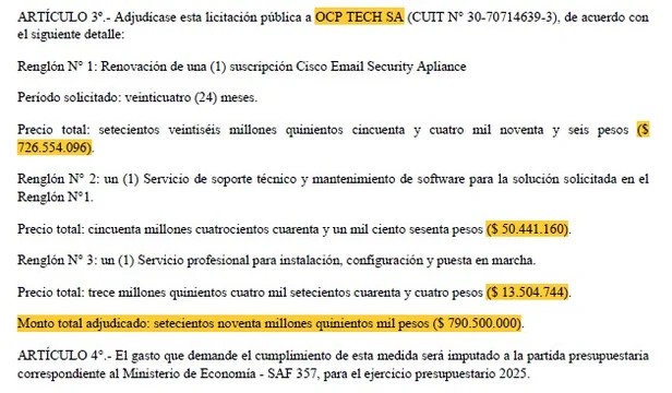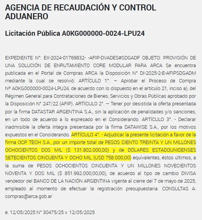 En mayo, el Boletín Oficial detalló otra jugosa compra, esta vez a cargo de la Agencia de Recaudación y Control Aduanero (ARCA, ex AFIP). La contratación indicaba la “provisión de una solución de enrutamiento core modular” y fue abonada con una chequera mixta: el Estado pagó $131.802.000 en pesos y, al mismo tiempo, otros US$758.000 en dólares. Traducido a la divisa argentina, el cálculo delata que el Poder Ejecutivo Nacional gatilló cerca de mil millones de pesos en una sola licitación para Scatturice.