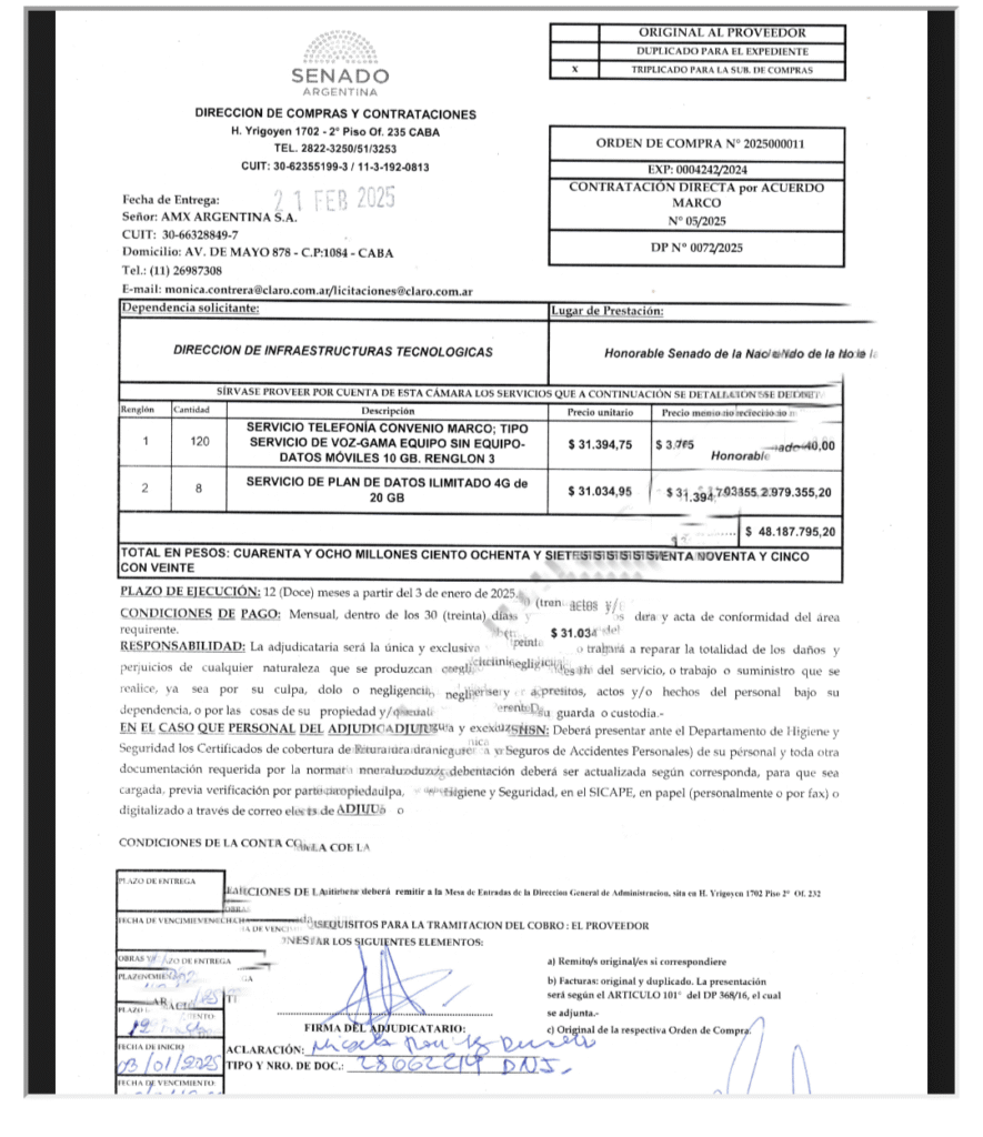 Percibiendo tales sumas, mínimo, se consideraría que los senadores pueden darse el gusto de contratar sus propios servicios y costearlos de sus bolsillos, pero las licitaciones del Senado de la Nación Argentina exponen lo contrario. El febrero pasado, la dirección de Compras avanzó con la contratación de “servicio de telefonía” y “plan de datos ilimitado 4C de 20GB” por un total de 48.187.795,20 pesos.