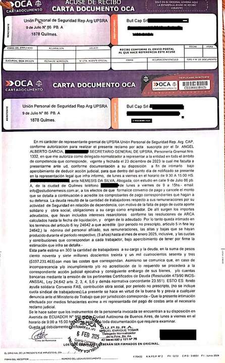 Según testimonios recabados, López, junto a un hombre que se presenta como “Ale Grande” —quien diría ser gestor del REBA—, ofrecería a locales nocturnos los servicios de la empresa de seguridad Bull Cap, que aplica el convenio de SUTCAPRA. De acuerdo a documentos a los que tuvo acceso este medio, Bull Cap tendría una deuda superior a 197 millones de pesos en aportes y contribuciones (según una carta documento que le enviara UPSRA), y pagaría a sus trabajadores en blanco apenas $20.000, cuando el convenio de UPSRA establece un salario bruto de $48.240, según denunció Alejandro Capalbo, representante de UPSRA CAP.