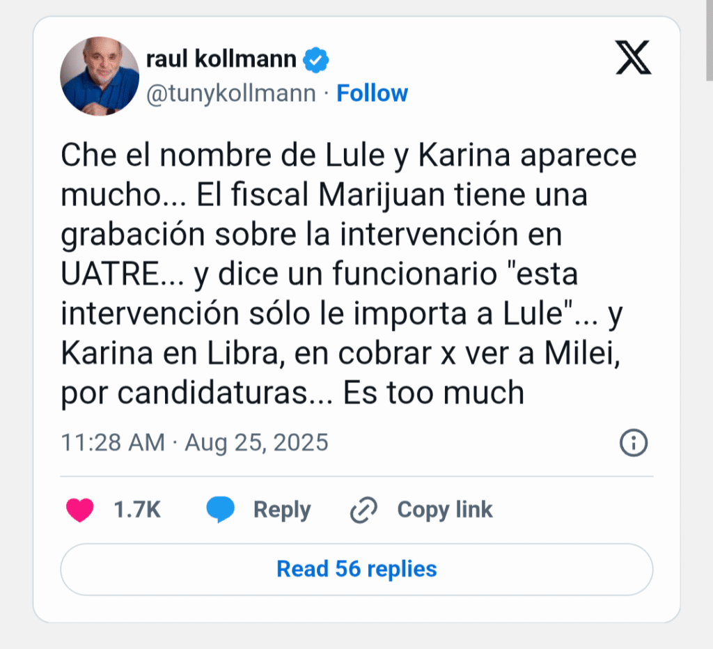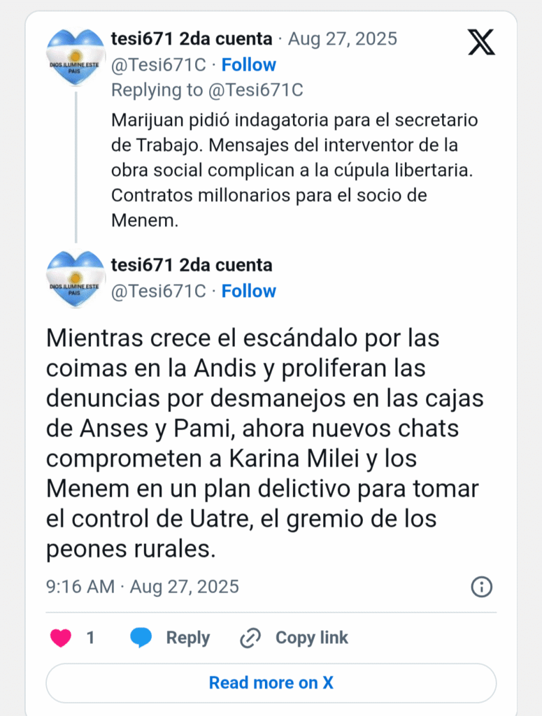 La secretaria general de la Presidencia, Karina Milei, y los primos Martín y Eduardo Lule Menem quedaron involucrados en otro supuesto caso de corrupción a partir de la aparición de nuevos chats que mostrarían su participación en un plan para tomar el control de la Unión Argentina de Trabajadores Rurales y Estibadores (UATRE), a la cual el Gobierno quiere intervenir desde hace meses.