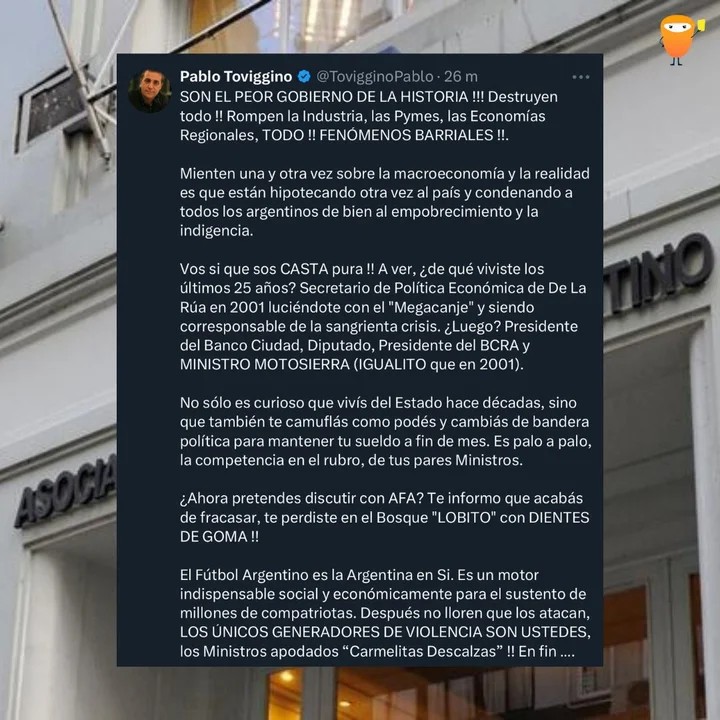 La guerra abierta entre integrantes del actual Gobierno y representantes de la AFA tuvo un nuevo capitulo este lunes en redes sociales. En el ida y vuelta, el Tesorero de la Asociación, Pablo Toviggino, cruzó a Federico Sturzenegger tras las modificaciones al decreto 1212.