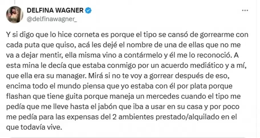 Según Wagner, Alfa también le fue infiel en varias oportunidades, e incluso una de las amantes se lo habría confesado a ella misma. “Y si digo que lo hice corneta es porque el tipo se cansó de gorrearme con cada puta que quiso, acá les dejé el nombre de una de ellas que no me va a dejar mentir, ella misma vino a contármelo y él me lo reconoció. A esta mina le decía que estaba conmigo por un acuerdo mediático y a mí, que ella era su manager“, se excusó.