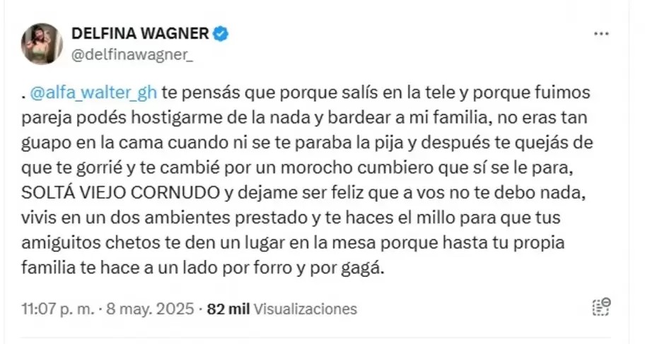 Delfina Wagner rompió el silencio y lo hizo a lo grande: con nombres, insultos y confesiones íntimas que hicieron temblar las redes. En un feroz descargo publicado en su cuenta de X (ex Twitter), la influencer de apenas 20 años disparó con munición gruesa contra su ex pareja, Walter “Alfa” Santiago, el polémico ex participante de Gran Hermano, con quien mantuvo un fogoso -y ahora evidentemente tormentoso- romance en 2023. “@alfa_walter_gh te pensás que porque salís en la tele y porque fuimos pareja podés hostigarme de la nada y bardear a mi familia”, escribió Wagner en su cuenta personal de la red social de Elon Musk.