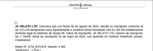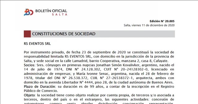 Paralelamente, Jonathan y María Ivonne, a quien llaman Ivy, constituyeron en 2020 una sociedad dedicada a la compra, venta y alquiler de automotores y a la organización de eventos, llamada RS Eventos SRL. Lo curioso es que si ellos fluctúan en esas actividades entre Buenos Aires y Punta del Este, a la empresa la instalaron en Salta. No es la única iniciativa federalista. En Mendoza Jonathan Kovalivker está al frente de JK Helat LTH. Ya en Buenos Aires, es accionista de Unicred Securities SA y de Unis Asesores de Riesgos S.A, ambas dedicadas a las finanzas.