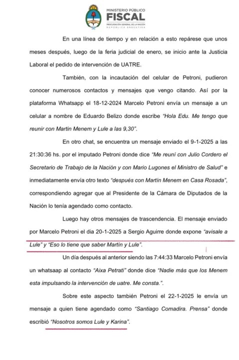 “Nadie más que los Menem esta impulsando la intervención de uatre. Me consta”2. En otro chat, le da una orden a Sergio Aguirre, socio de Martín Menem en otra empresa investigada, HTech: “avísale a Lule” y “Eso lo tiene que saber Martin y Lule”3.