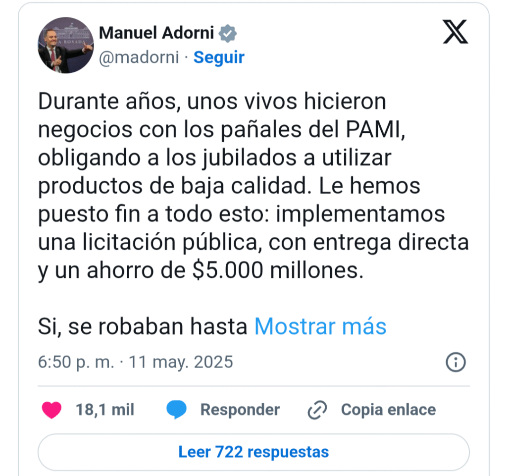 A través de sus redes sociales, Adorni afirmó que “durante años, unos vivos hicieron negocios con los pañales del PAMI, obligando a los jubilados a utilizar productos de baja calidad. Le hemos puesto fin a todo esto: implementamos una licitación pública, con entrega directa y un ahorro de $5.000 millones”.