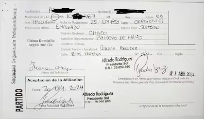 La sospecha central es que Rodríguez —y su círculo más cercano— habría utilizado las bases de Anses y PAMI para identificar ciudadanos en situación de vulnerabilidad y proceder a su afiliación sin consentimiento. En todos los casos detectados, las planillas estaban acompañadas por fotocopias del DNI y las firmas fueron certificadas por el propio Rodríguez, en su rol de autoridad partidaria. este medio accedió a tres de ellas.