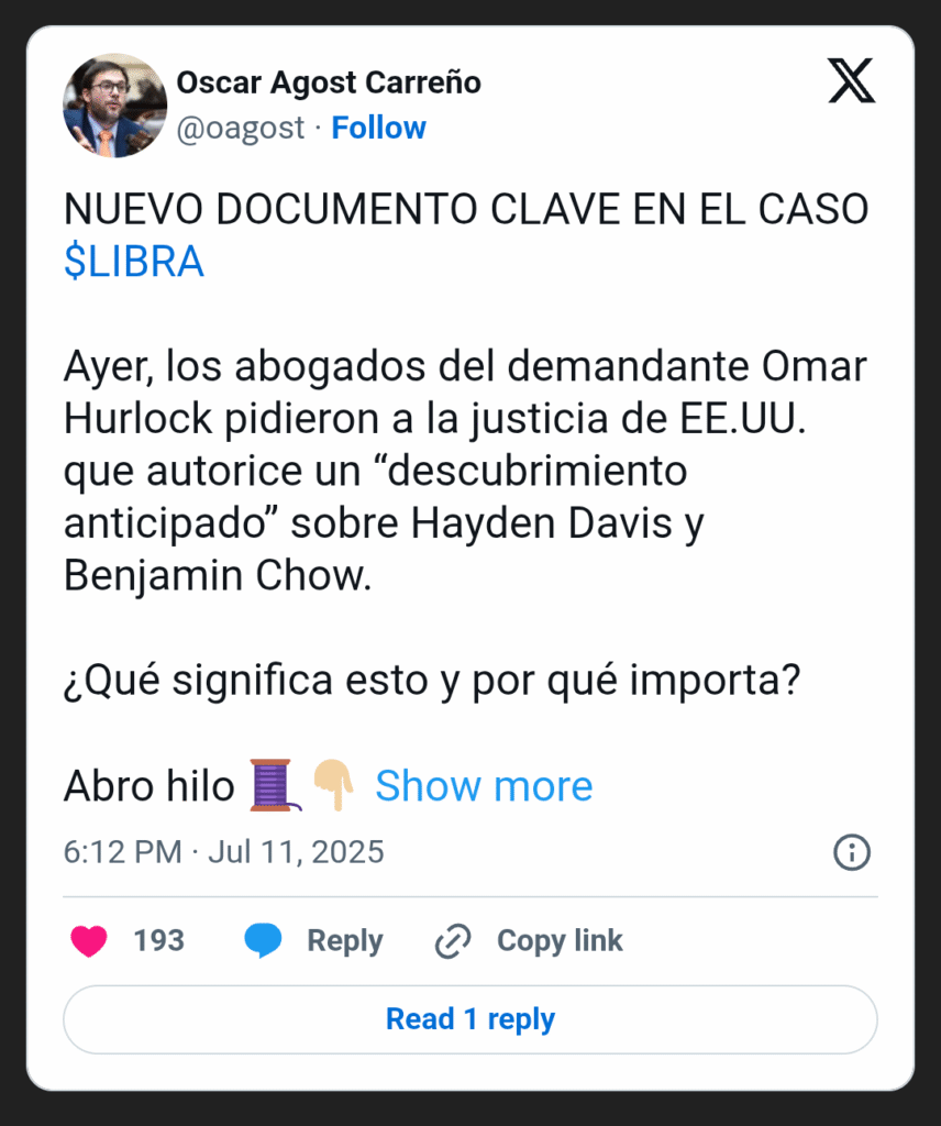La investigación judicial estadounidense también apunta a Ben Chow, cofundador de la exchange Meteora y arrepentido de la causa $LIBRA, por haber trabajado previamente con Hayden Davis en otro token que ejecutó la misma modalidad de estafa. “Acabo de habilitar al mayor criminal del mundo”, dijo Chow sobre Davis.