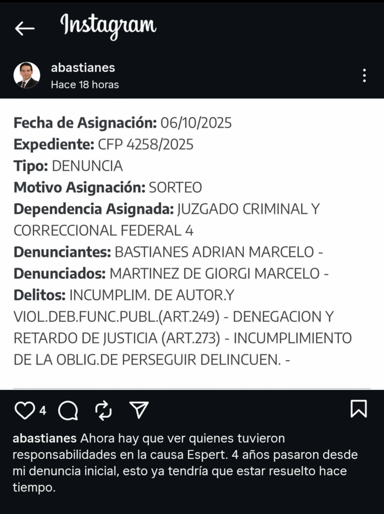 Según el expediente CFP 4258/2025, la presentación fue realizada este 6 de octubre ante la Cámara Nacional de Apelaciones en lo Criminal y Correccional Federal por Adrián Marcelo Bastianes, quien lo acusa de denegación y retardo de justicia artículo 273), incumplimiento de la obligación de perseguir delitos (artículo 274) e incumplimiento de los deberes de funcionario público (artículo 249).