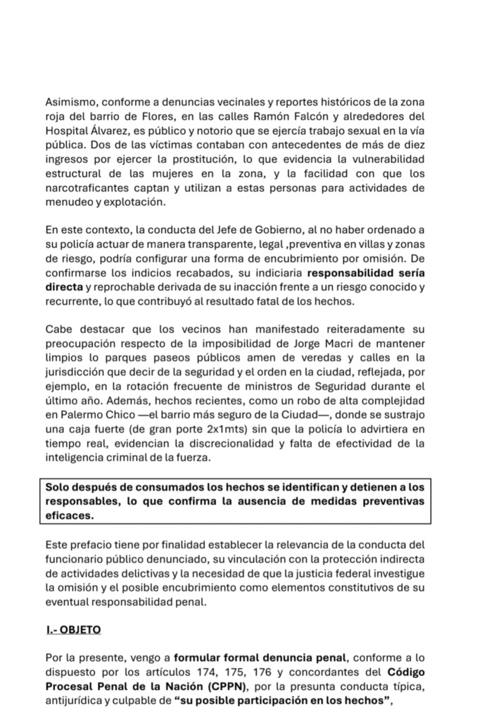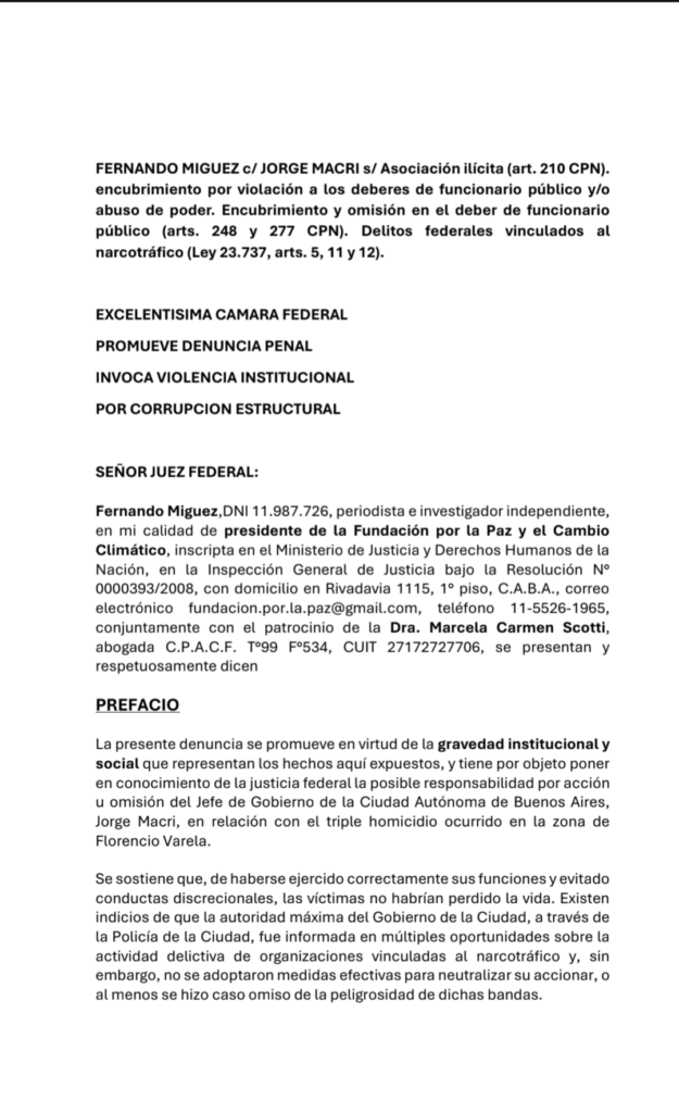 El periodista e investigador Fernando Míguez, presidente de la Fundación por la Paz y el Cambio Climático, presentó una denuncia penal en la justicia federal contra un importante dirigente de Propuesta Republicana (PRO), a quien señala por presunta asociación ilícita, encubrimiento y omisión de deberes de funcionario público en el marco del triple homicidio de mujeres ocurrido en Florencio Varela el pasado 20 de agosto.