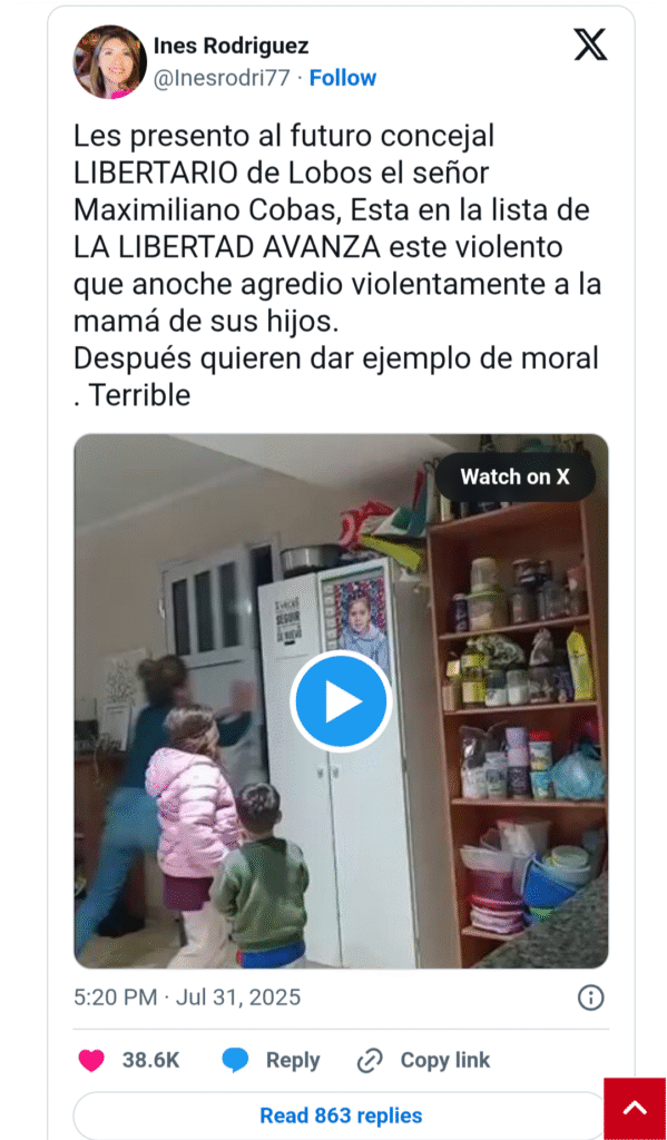 Maximiliano Cobas, quien ocupaba el quinto lugar en la lista de concejales titulares de La Libertad Avanza en Lobos, renunció a su candidatura tras la difusión de un video que lo muestra ejerciendo violencia de género y familiar. El hecho, que tomó repercusión pública a través de redes sociales, derivó en una denuncia penal, su imputación judicial y medidas de protección para la víctima.